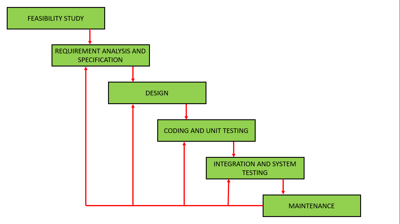 – 전통적인 폭포수 모델에서는 피드백 경로가 없어 오류 수정을 위한 메커니즘이 없다. 그러나 한 단계에서 이전 단계까지의 반복적 폭포수 모델은 피드백 경로를 통해 커밋된 오류를 수정할 수 있으며 이러한 변경 사항은 이후 단계에 반영된다.