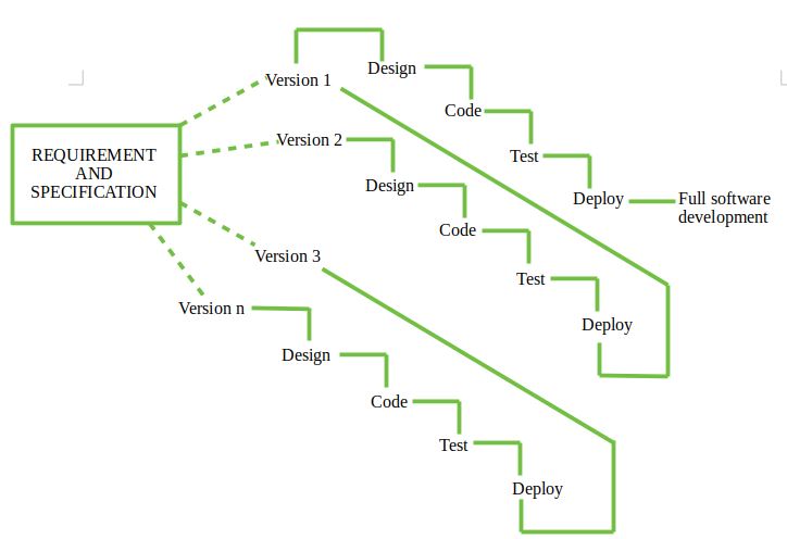 요구사항 수집 및 사양 후 요구사항은 버전 1을 시작으로 여러 버전으로 분할되며, 각 단계마다 다음 버전이 구성된 후 고객에 배포된다. 마지막 버전(버전 n) 이후에는 클라이언트에 배포된다.