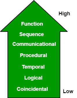 - 우연적 응집도(Coincidental Cohesion): 모듈들이 관련이 없는 경우를 말한다. 이러한 모듈들은 소스 코드 내에서 위치하는 것 이외에는 개념적인 관련성이 전혀 없다. 이러한 경우는 우연적이며 가장 나쁜 응집 형태다.